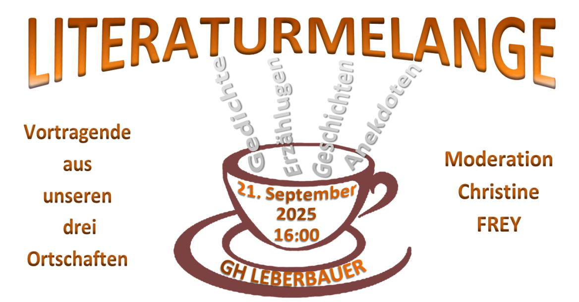 Christine Frey hat in bewährter Weise die LITERATURMELANGE am 21. September vorbereitet und organisiert. Viele Kulturinteressierte aus Nah und Fern folgten dem Ruf ins Gasthaus Leberbauer.