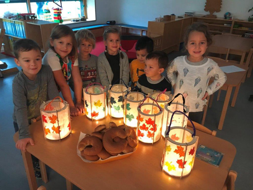 Umso größer war dann die Freude, als wir die schönen, von den Kindern selbst gestalteten Laternen aufstellten und unsere Lieder und Gedichte darboten. Nach einem Umzug mit den Laternen, ließen wir das Fest bei Punsch, Lebkuchen und Aufstrichbroten im Garten ausklingen.