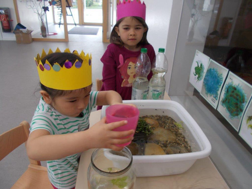 Die Jahreszeit bietet sich im Kindergarten besonders für intensive Naturbeobachtung an, weil die Pflanzen- und Tierwelt wieder erwacht. Auf dem Bild unten links sieht man die Kinder beim Beobachten unserer Distelfalterraupen – gespannt verfolgen wir ihre Metamorphose bis zum Schmetterling. Am Bild unten rechts wird gerade das Wasser für die Kaulquappen getauscht– auch hier warten wir schon gespannt, bis sie Beine ausbilden.