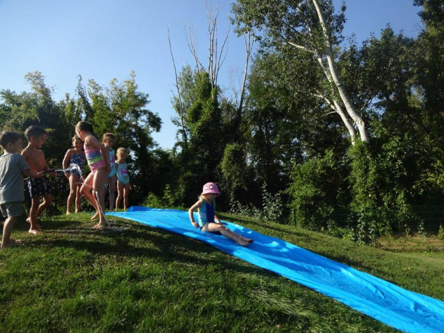 Was für ein Sommer! Uns war so heiß im Kindergarten, dass wir nur mit Wasser spielten. Die Wasserrutsche war eine lustige Abwechslung.