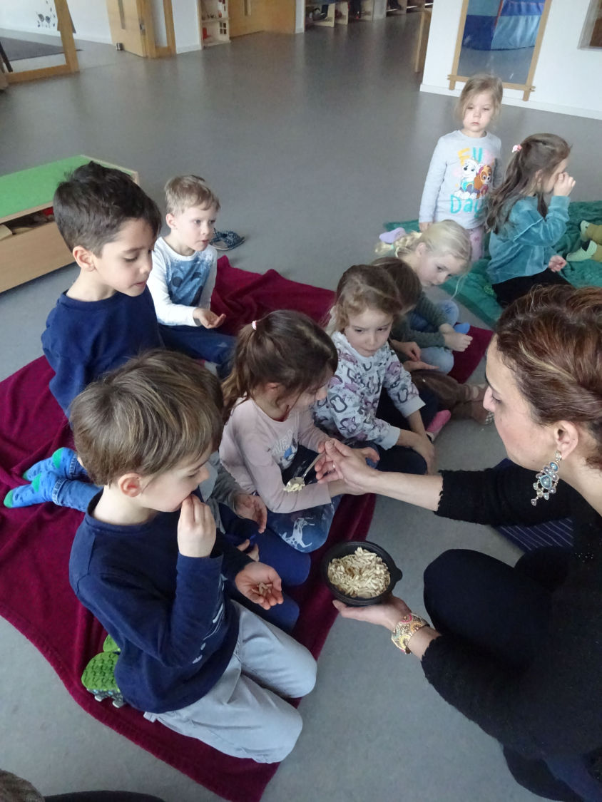Viele Kinder, die unseren Kindergarten besuchen, sind mit anderen Kulturen vertraut, da Mitglieder ihrer Familie aus anderen Ländern nach Österreich gezogen sind. Auf spielerische Weise und mit Unterstützung der Eltern und der Interkulturellen Mitarbeiterin, die uns 1 mal im Monat besucht, begegnen wir gemeinsam uns fremden Kulturen und lernen ihre Besonderheiten und Bräuche kennen. Wir bekamen Persisches Essen, haben türkische und albanische Spezialitäten gekocht, lernen uns in verschiedenen Sprachen zu begrüßen und zu zählen. Auch Tänze stehen auf unserem Programm. Bis zum Sommer planen wir noch einen rumänischen, ukrainischen, polnischen und englischen Tag. Dieses Angebot macht Kindern Freude und wir lernen uns mit Respekt und Toleranz zu begegnen, was gerade in der heutigen Zeit von großer Bedeutung ist.