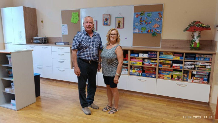 Fristgerecht wurden die neuen Möbel geliefert und montiert. Frau Sylvia Pfeifer und Bgm. Roman Sigmund freuen sich über die gelungene Arbeit unseres Tischlermeisters.