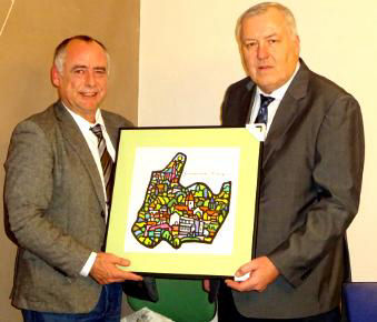 Als Geschenk überreichte Bgm. Sigmund ein Bild von Laf Wurm, das die Großgemeinde als Ganzes zeigt. Als zusätzliche Überraschung wartete der Musikverein Haringsee nach der Gemeinderatssitzung vor dem Gemeindeamt mit einem Ständchen auf.