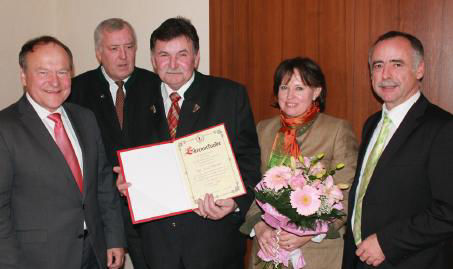 Foto v.l.n.r. Präs. Abg.z.Nr. Ing Hermann Schultes, Vzbgm. Raimund Poitschek, Ing. Josef Breuer mit Gattin Rosemarie, Bgm. Roman Sigmund