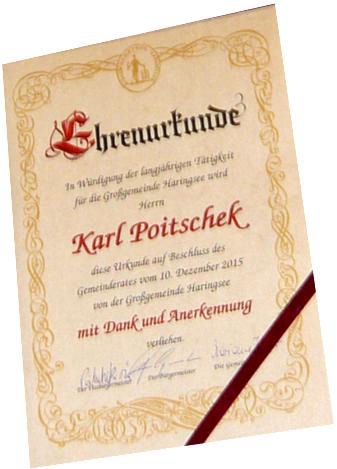 Ehrenurkunde - In Würdigung der langjährigen Tätigkeit für die Großgemeinde Haringsee wird Herrn Karl Poitschek diese Urkunde auf Beschluss des Gemeinderates vom 10. Dezember 2015 von der Großgemeinde Haringsee mit Dank und Anerkennung verliehen.