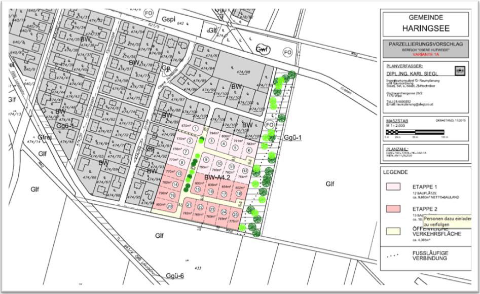 Wie auf dieser Grafik ersichtlich werden in Summe 25 neue Bauplätze für Einfamilienhäuser entstehen. Die Vergabe erfolgt nach den Aufschließungsarbeiten in 2 Etappen.