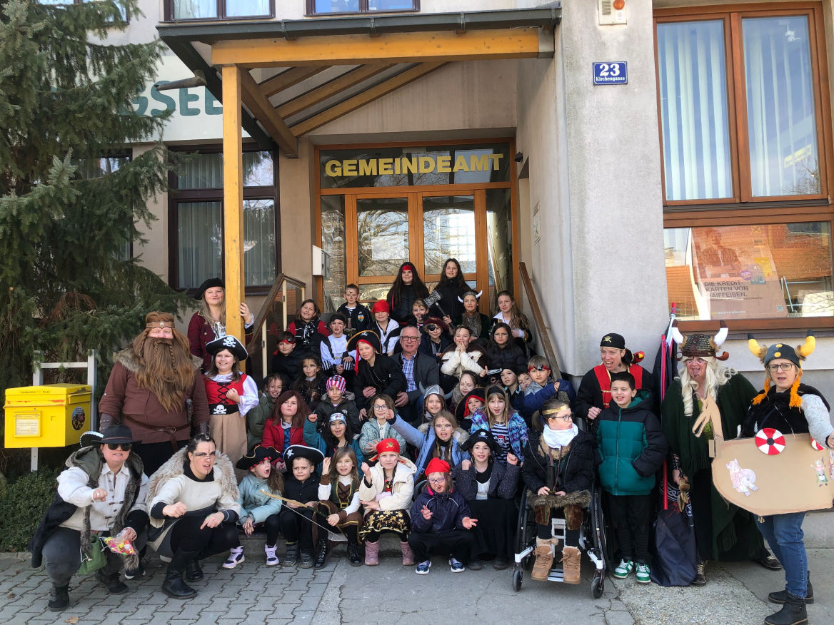 Nach lustigen Liedern von Piraten und Wikingern vor dem Gemeindeamt regnete es Süßigkeiten für die Kinder aus dem ersten Stock.