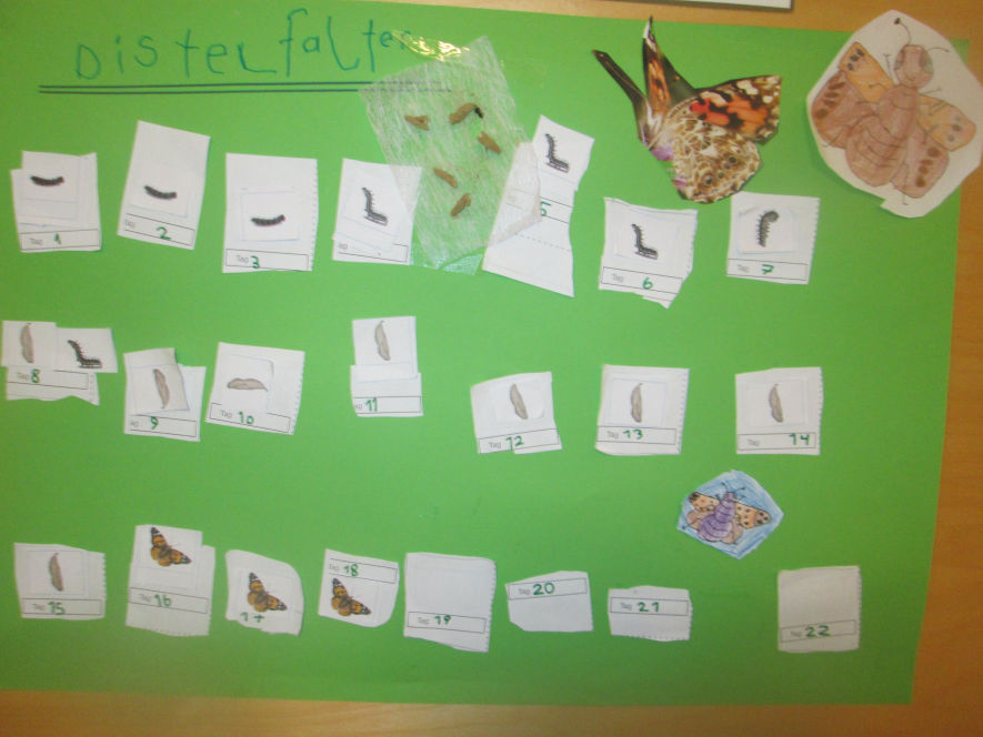 Wir haben im Mai den Lebenszyklus eines Schmetterlings beobachtet. Vom Ei, zur Raupe, zur Puppe zum Schmetterling. Auf einem selbst gestalteten Kalender haben wir festgehalten, dass der erste Schmetterling am 16. Tag aus der Puppe geschlüpft ist.