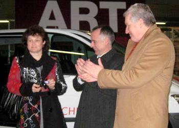Landesrätin Petra Bohuslav und Bürgermeister Roman Sigmund übergeben einen symbolischen Schlüssel der Leiterin des Kindergartens und der Leiterin der Tagesbetreuungseinrichtung. |