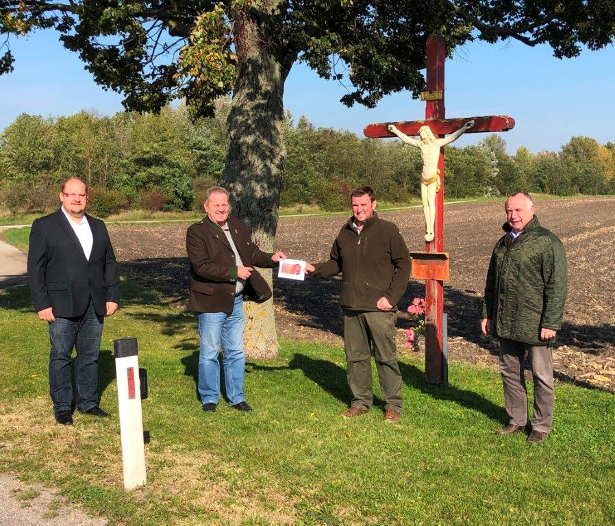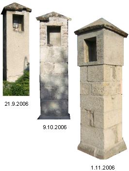 | 1801 | Ein Marterl, welches mittlerweile im Garten des Landwirtes Wald steht, befindet sich an einem Weg zu den Wallfahrtsorten Groissenbrunn und Maria Tal (Slowakei). Es ist der Brauch dieser Zeit, sich vor Antritt einer Wallfahrt von seinem Heimatorte zu verabschieden. Wallfahrtskreuz |