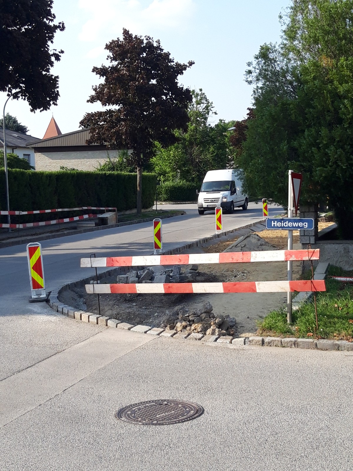 Ziel ist es, dass bereits mit Beginn des kommenden Schuljahres der Fahrplan entsprechend angepasst wird, damit alle Schulkinder und alle erwachsenen Fahrgäste der neuen Siedlungsgebiete nicht mehr bis zur Ortsmitte zu ihren Bussen gehen müssen. Foto: Baustelle Bushaltestelle Ecke Heideweg / Pframastraße (11.6.2019) |