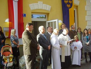 Die offizielle Eröffnungsfeierlichkeit des Kindergartens findet am 29.11.2019 um 10 Uhr statt. Bürgermeister Roman Sigmund begrüßt alle Anwesenden und führt durch das Programm. Es folgen Grußworte von der Kindergartenleiterin Christine Treu sowie Erklärungen zur Architektur des neuen Gebäudes durch Arch. DI Klaus Stubenvoll. Bei der Festrede durch Landesrätin Petra Bohuslav in Vertretung von Landeshauptfrau Johanna Mikl-Leitner wird unter anderem die freundliche, helle Atmosphäre des Gebäudes in den Vordergrund gerückt. Pfarrer Gregor Ziarnowski übernimmt die feierliche Segnung des Hauses.