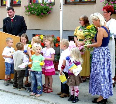 Nach den allgemeinen besten Glückwünschen für den kommenden Betrieb schließt der Musikverein Haringsee mit der Nö Landeshymne den offiziellen Festakt, an dem alle Kinder - auch Volksschulkinder - maßgeblich beteiligt waren. Der Neubau wurde von Fr. Mag. Engelbrecht von der Nö Energie- und Umweltagentur mit der „Ausgezeichnet gebaut Plakette“ ausgezeichnet. Die vom Land Niederösterreich anerkannten Projektkosten betragen € 1.805.500,00. |