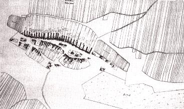 1750 In Wien wird Schloß Schönbrunn fertiggestellt. Ortsplan von Haringsee aus dem Jahre 1751, der Sumpf reicht bis zum Dorf. |